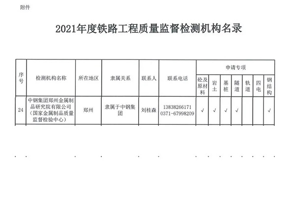 近日,鐵(tie)路集團(tuan)有(you)限公司工(gong)程質(zhi)量(liang)監督管理局發布了(le)《關于公布2021年度(du)鐵(tie)路工(gong)程質(zhi)量(liang)監督檢(jian)測機(ji)構名錄的通知》,并將滿足(zu)合格條件的91家監督檢(jian)測機(ji)構進行(xing)公示,中(zhong)(zhong)鋼(gang)集團(tuan)鄭州(zhou)金屬(shu)制(zhi)品研究(jiu)院(金屬(shu)制(zhi)品質(zhi)量(liang)監督檢(jian)驗中(zhong)(zhong)心)再次上(shang)榜入圍(wei),這標志著中(zhong)(zhong)鋼(gang)國檢(jian)的工(gong)程檢(jian)測能力得到了(le)高度(du)認(ren)可(ke)。
