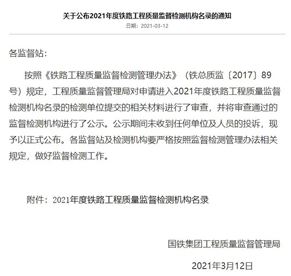 中鋼(gang)國檢此(ci)次入圍(wei)成功獲批(pi)了砼及原材料、巖土、基(ji)樁、隧道、鋼(gang)結構五個專項(xiang)檢測(ce)資(zi)質,相比2020年,今年新增獲批(pi)了巖土專項(xiang)檢測(ce)資(zi)質,進一步擴大了鐵路(lu)工(gong)程檢測(ce)業務范圍(wei)。